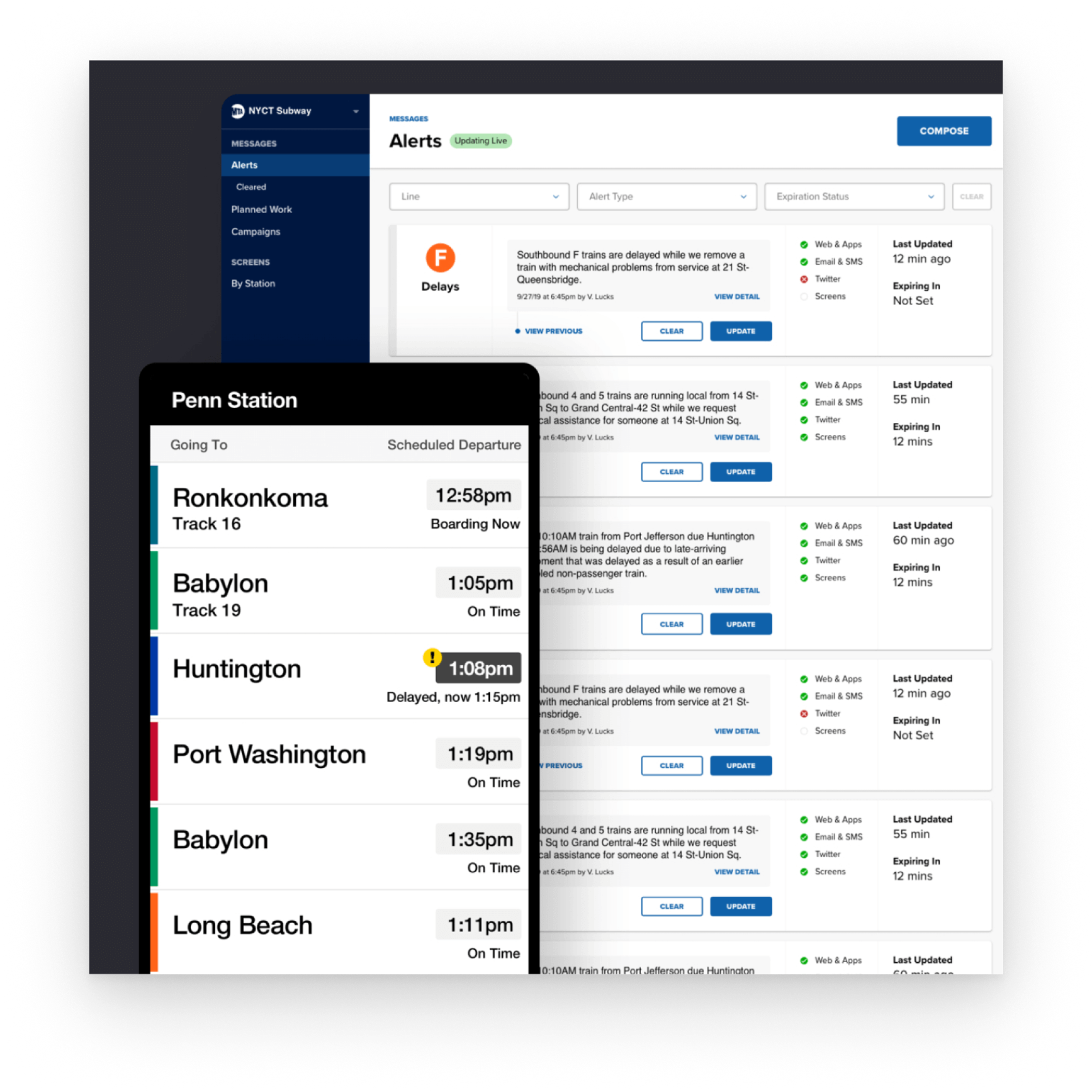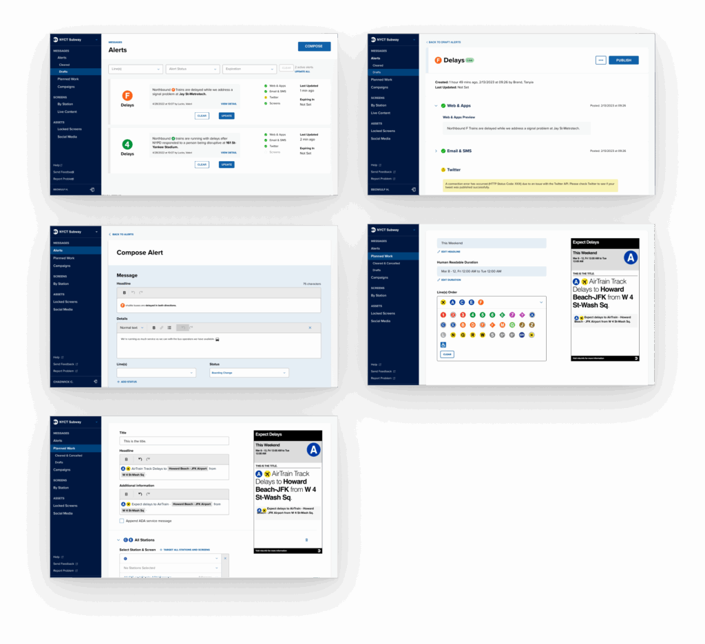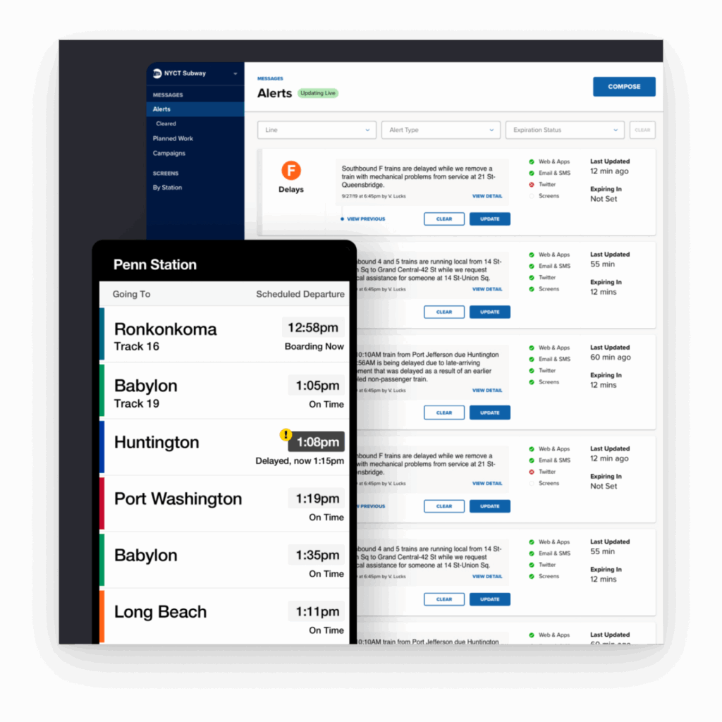 We built MTA Mercury: a central CMS and source-of-truth communication tool for the MTA—where a message can be written once and published across multiple endpoints. Anyone in the MTA can easily program and control messaging heading out to millions of riders on a daily basis. Because MTA Mercury was built with the future in mind, it’s ready to support all the apps and experiences of a digitally transformed New York.