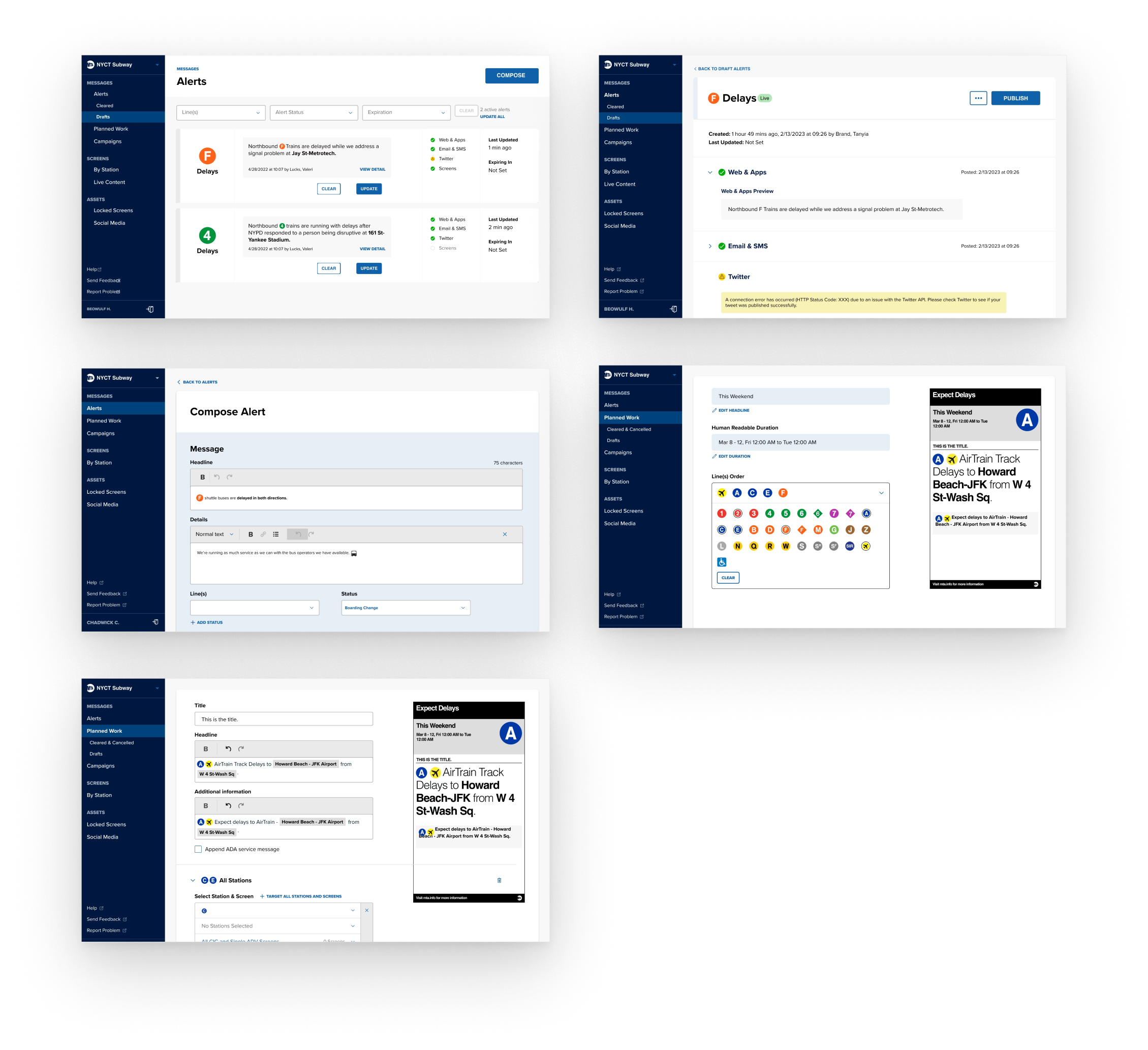Through user research, interviews and analysis, we conceived a design that greatly simplified message creation and publication. Working in parallel, software engineers began architecting a modern, flexible software platform using technologies like GraphQL and React. Thanks to continuous deployments, MTA teams could test and provide feedback after only a few months.