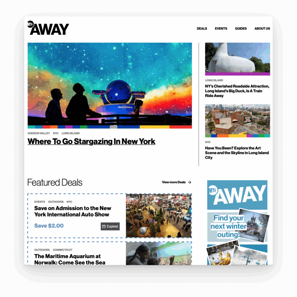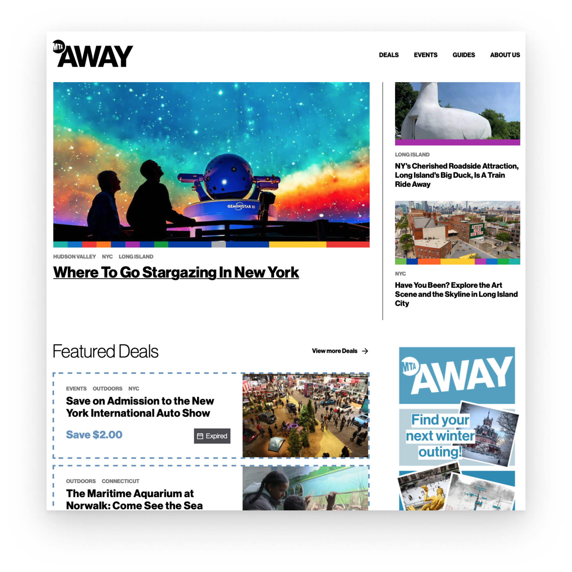 Over a seven week sprint, in the role of a Product Manager, I led a team to redesign the MTA Away website. As a destination developed in partnership with the MTA, our mandate to improve the experience to help travelers discover new deal, events, guides, and information.
